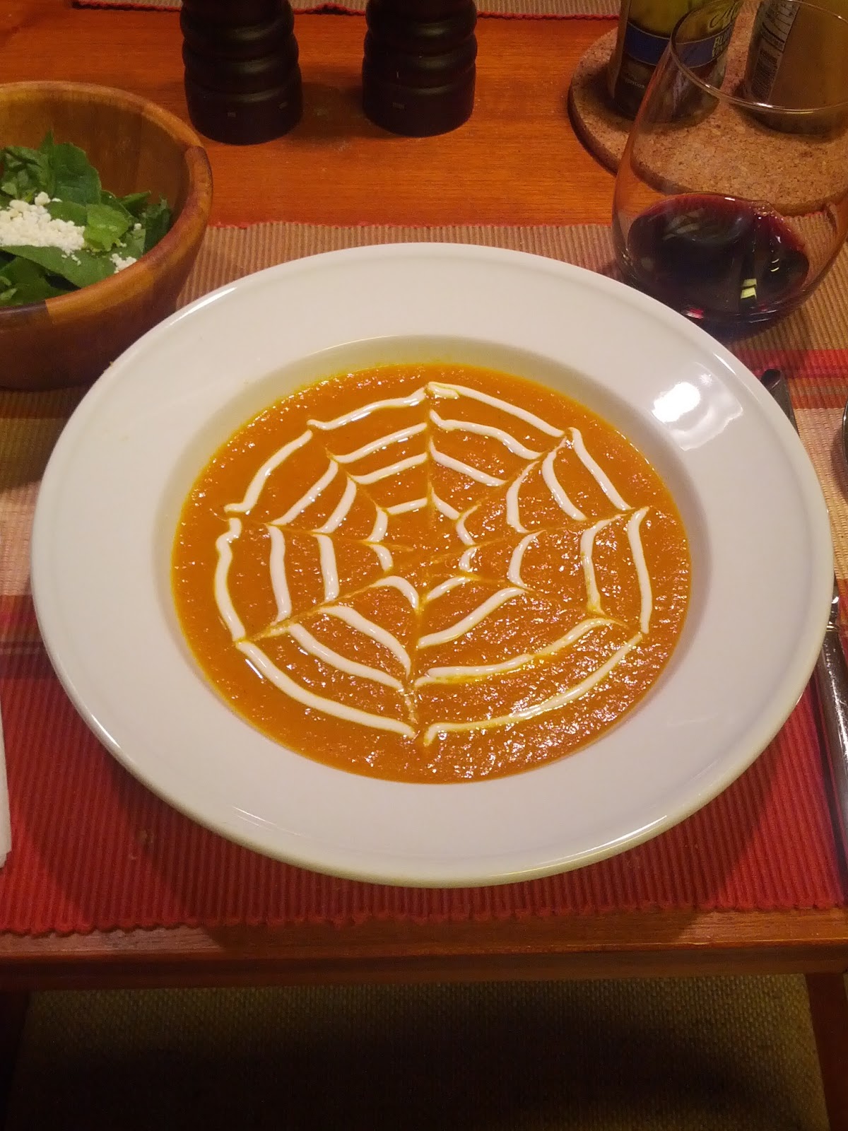 If you’ve read my short story, “Nothing to Fear but Fear Itself (and Spiders),” you might be curious about the meal that Macy prepares for Stan: “carrot bisque with sour cream drizzled into a spider web pattern on the top – More spiders! Who wants to think about spiders when they’re eating?